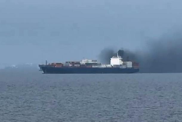 This image, taken from video footage shot by seafarer Wang Shang on Thursday, shows smoke billowing from a cargo vessel in the Gulf
