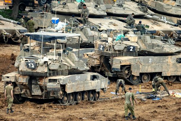 Israeli soldiers work on the belts for their tanks at a staging area in the Upper Galilee in northern Israel near the border with Lebanon on March 13, 2026