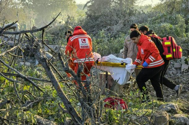 First aid responders evacuate a body from the site of an Israeli airstrike that targeted the southern Lebanese city of Tyre