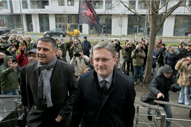 Culture Minister Nikola Selakovic, centre, arrives at the Belgrade courthouse greeted by dozens of protesters