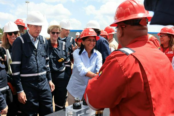 Venezeula's interim president Delcy Rodriguez greets a worker from the state oil company PDVSA next to US Secretary of Energy Chris Wright (2nd L) during a visit to the Orinoco Oil Belt in southern Venezuela
