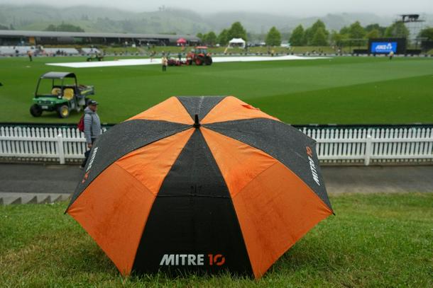 A fan shelters under an umbrella before the T20 between New Zealand and the West Indies was washed out on Monday