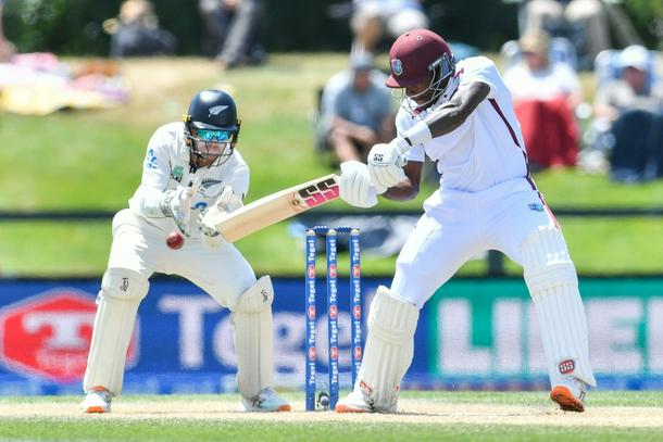 West Indies' Justin Greaves plays a shot in front of New Zealand's wicketkeeper Tom Latham