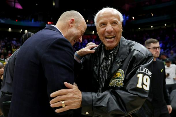 Lenny Wilkens, former Seattle SuperSonics head coach greets others before the Rain City Showcase in a preseason NBA game in 2023