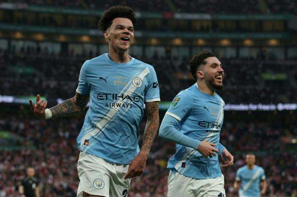 Manchester City's Nico O'Reilly (L) celebrates scoring against Arsenal in the League Cup final