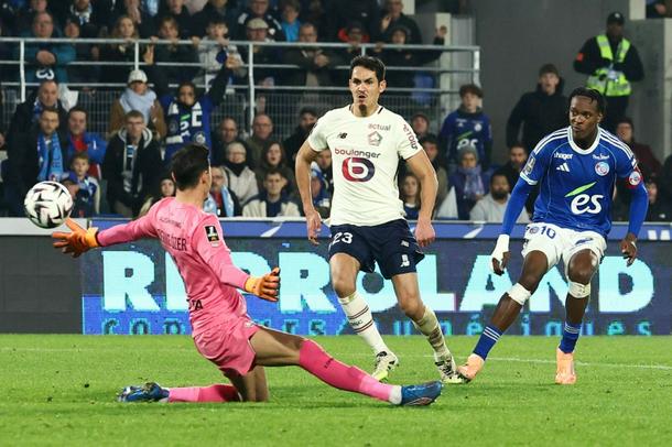 Emanuel Emegha (R) pounces to put Strasbourg two goals up against Lille