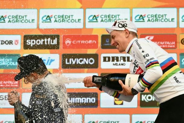 Tadej Pogacar (R) beat Tom Pidcock (L) to Milan-San Remo glory