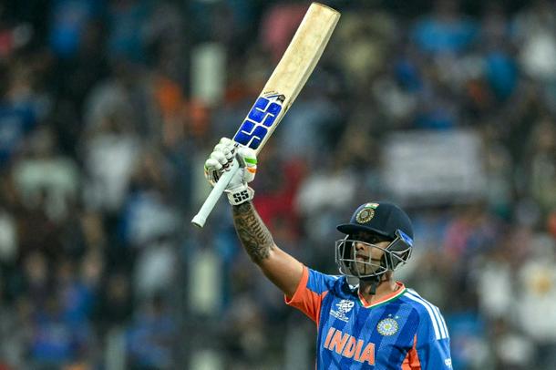 India's captain Suryakumar Yadav celebrates his fifty against the USA in Mumbai