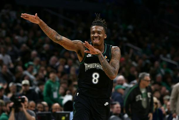 Minnesota's Bones Hyland celebrates a three-pointer in the Timberwolves win over the Boston Celtics