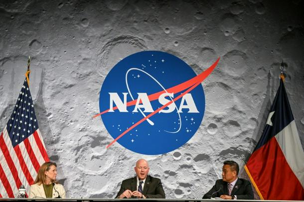 NASA officials Lori Glaze (L) and Howard Hu (R) listen to NASA flight director Judd Frieling speak during a status briefing of the Artemis II lunar mission at Johnson Space Center in Houston, Texas
