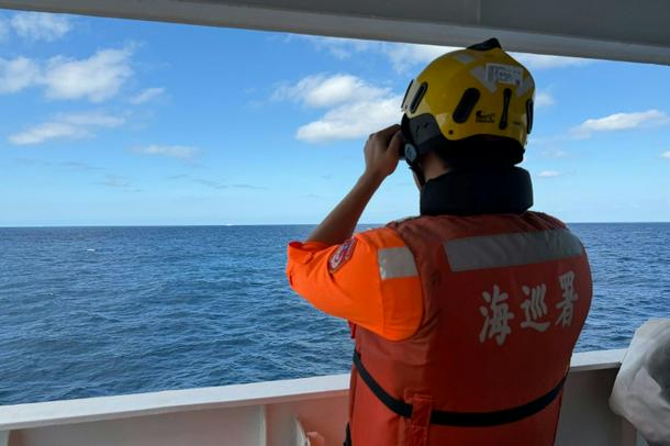 This handout photo taken and released on December 29, 2025, by the Taiwan Coast Guard shows a coast guard administration crew member observing Chinese coast guard ship No. 1303 from the CGA's "Yilan" patrol vessel 23 nautical miles northwest of Pengjia Islet