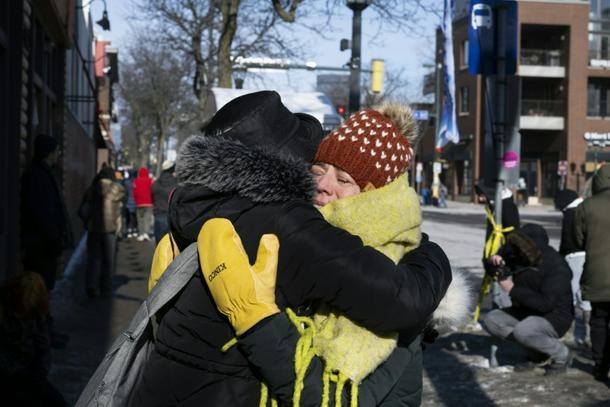 Two women hug at a makeshift memorial in the area where Alex Pretti was shot dead by federal immigration agents in Minneapolis, Minnesota, on January 26, 2026