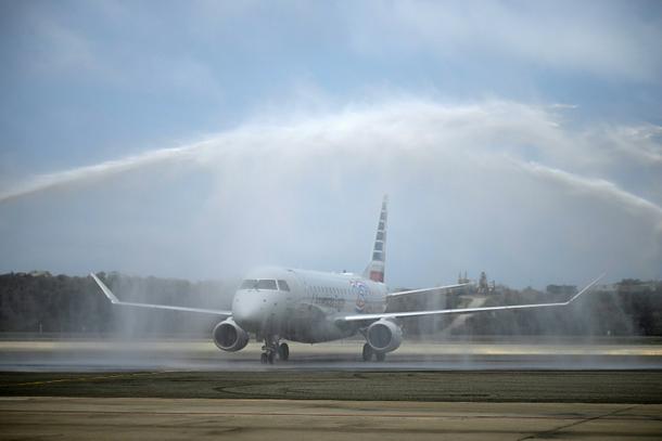 An American Eagle aircraft receives celebratory sprays of water after landing in Venezuela as the first direct flight from the United States in years