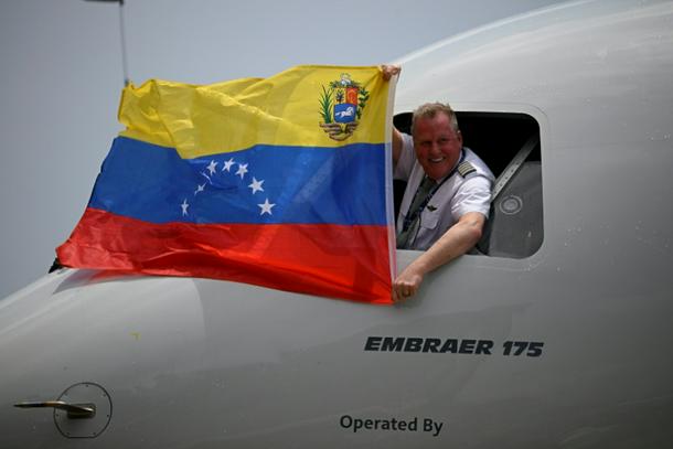 To celebrate, two Venezuelan fire service trucks hosed the plane on the tarmac after its arrival.