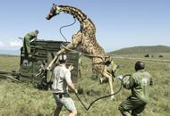 Coaxed and tugged by rangers, a blindfolded giraffe totters into the specialised vehicle that will transport it away …