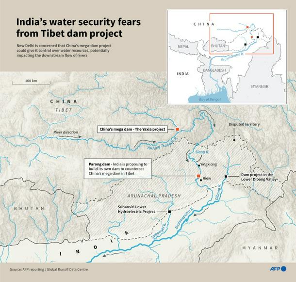 Infographic map showing the main mega dam projects in India's Arunachal Pradesh state and Tibet region of China.