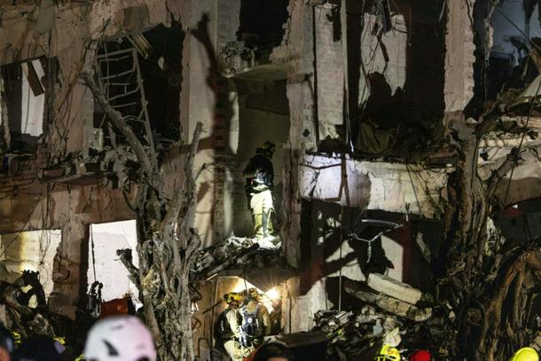 In this picture obtained from Iran's ISNA news agency, rescuers search through the rubble of a collapsed building at the site of a strike in Tehran