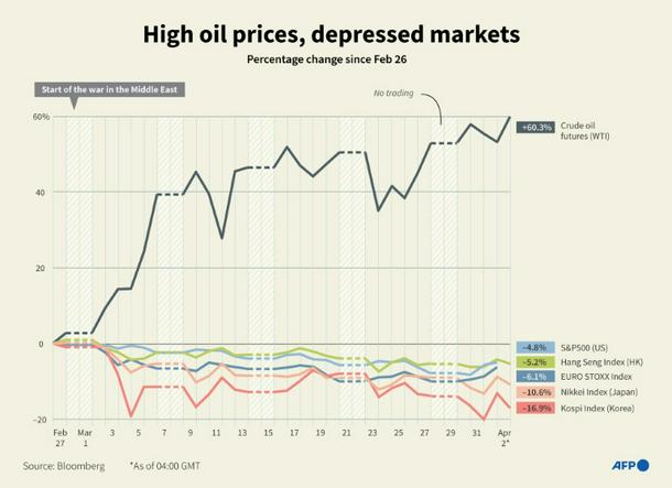 Infographic chart showing the performance of WTI crude oil futures against selected indexes, up to April 2 at 04:00 GMT.