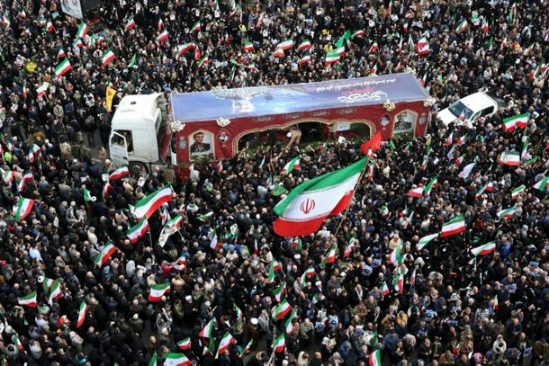 Pro-government Iranians voiced defiance as they marched in Tehran at the funeral of a Revolutionary Guards naval commander killed in an Israeli strike.
