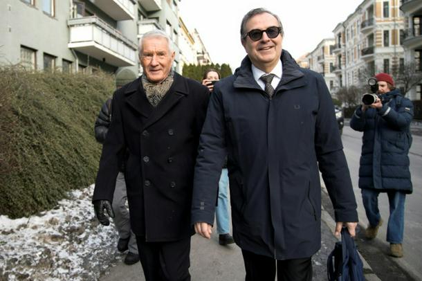 Norway's former prime minister Thorbjorn Jagland (L) and his lawyer (R) put on smiles as they left one of the premises being searched