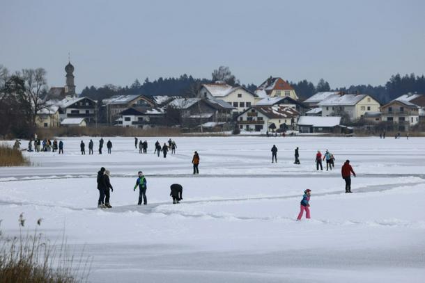 People ice skate over the frozen Klostersee lake close to Seeon Abbey in southern Germany