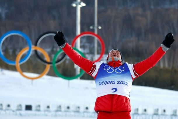 Alexander Bolshunov celebrates winning a cross-country skiing gold for Russia at the 2022 Beijing Winter Olympics