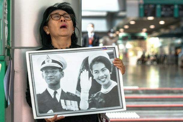 Thai mourner Kanjana Malaithong holds a portrait former queen Sirikit and king Bhumibol Adulyadej as she weeps at Chulalongkorn Hospital in Bangkok