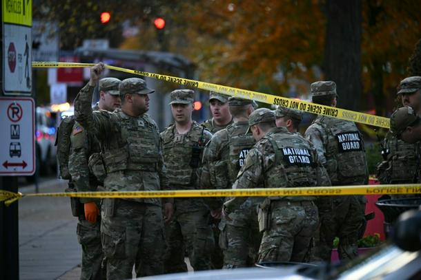 National Guard soldiers stand behind crime scene tape at a corner in downtown Washington where two National Guard soldiers were shot just blocks from the White House