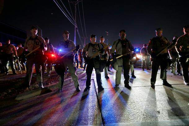 Illinois State Police stand guard while monitoring protesters gathering near an Immigration and Customs Enforcement (ICE) facility in Broadview, Illinois