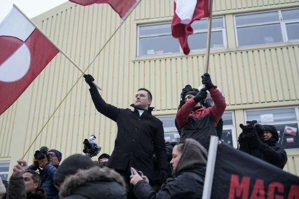 Greenland's prime minister Jens-Frederik Nielsen (L) holds a Greenlandic flag at a demonstration against US President Donald Trump's wish to take over the territory