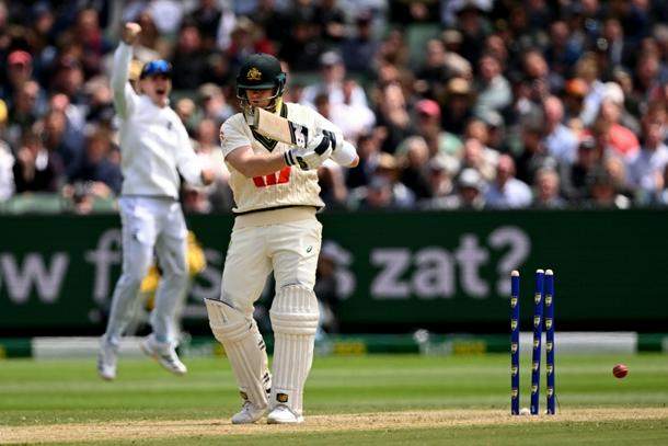 Opening partner Jake Weatherald fared little better, tickling down the leg side to wicketkeeper Smith on 10 in Tongue’s first over, with the Nottinghamshire quick then enticing an edge from Marnus Labuschagne (six) that was well taken by Root at slip.