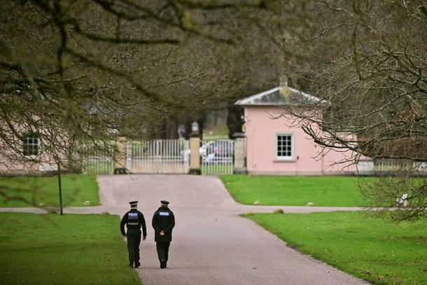 Police officers walk towards the entrance to Royal Lodge, a 30-room property in Windsor and past residence to Britain's former prince Andrew where police said they are still conducting a search