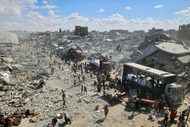 Conditions remain dire in Gaza, were Palestinians are seen gathering at aid trucks as a ceasefire between Israel and Palestinian factions holds in the besieged territory