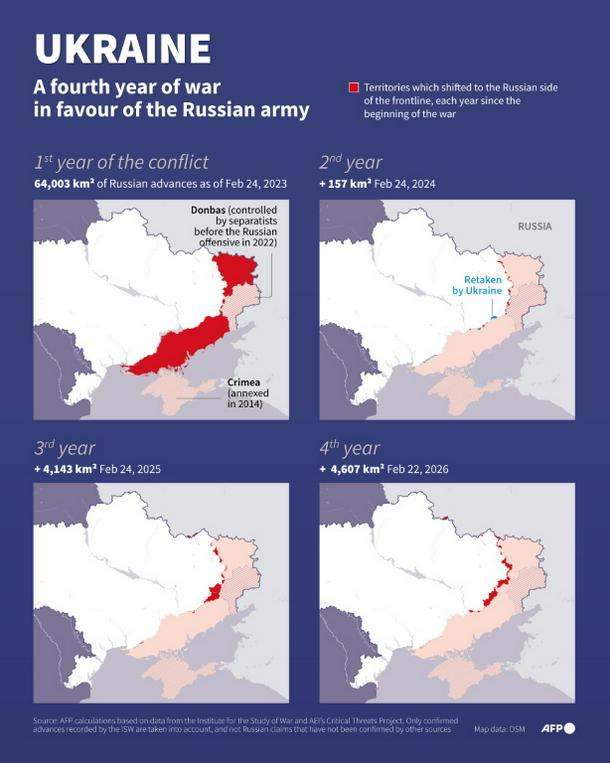 Kyiv (Ukraine) (AFP) - Vladimir Putin has not broken Ukraine, its leader Volodymyr Zelensky said Tuesday, as the Kremlin marked the start of the fifth year of its invasion by vowing to keep fighting Europe’s bloodiest conflict since World War II until it achieves its goals.