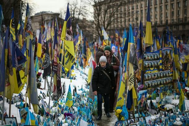 A makeshift memorial for soldiers fallen fighting for Ukraine is set up in Kyiv's Independence Square