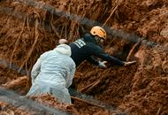 Three firemen pulled a man's body from the mud amidst the rubble of houses swept away in a landslide in southeastern …