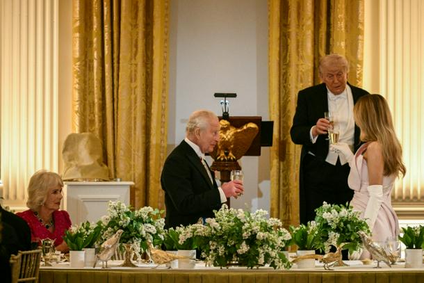 Britain's King Charles III shared a toast with US President Donald Trump and First Lady Melania Trump as Queen Camilla looks on during a State Dinner in the East Room of the White House