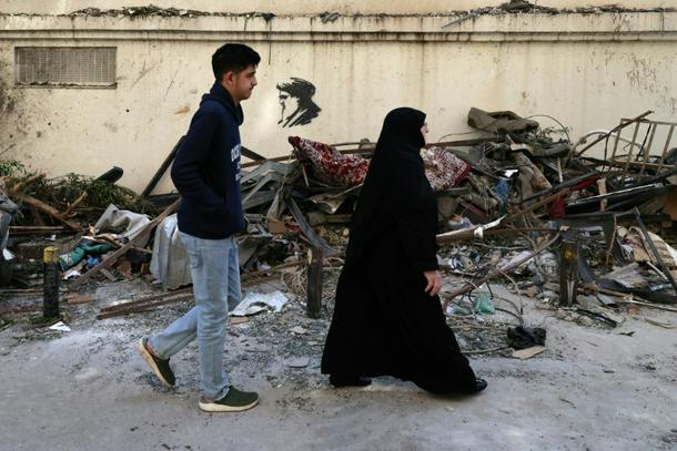 Residents of Beirut walk past scattered debris at the site of an Israeli airstrike