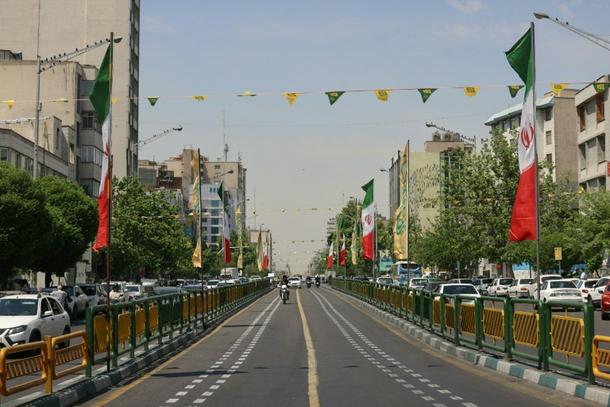 Vehicles drive along a street adorned with Iranian flags at Revolution Square in Tehran on Tuesday