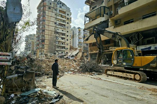 A bulldozer clears the rubble from the site of an Israeli airstrike as people return to Beirut's southern suburbs